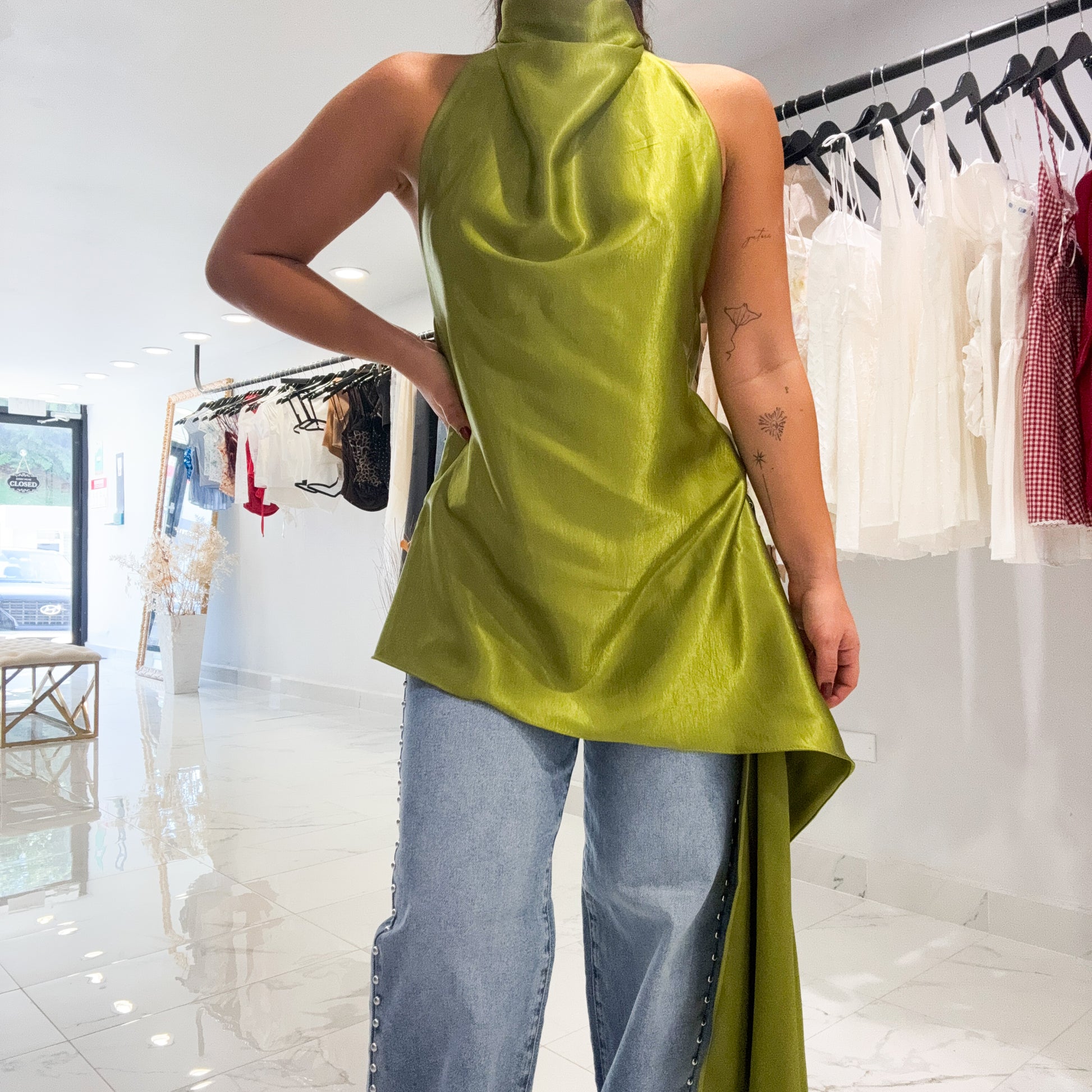 Halter uneven hemline tunic top lime green